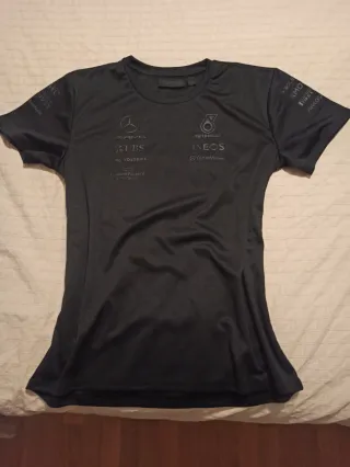 Camiseta de Mercedes-Benz para mujer. Puesta 1 vez. - Diseño con logos de patrocinadores. - Cuello redondo y manga corta.