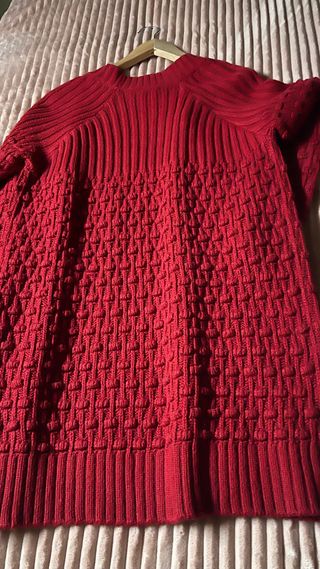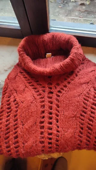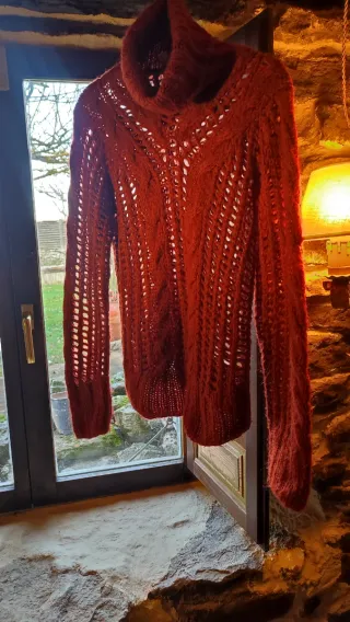 Jersey de punto calado con cuello alto de la marca Mango. Su diseño es moderno y elegante. Color muy bonito y muy favorecedor Está nuevo - Tejido suave y agradable. - Diseño de punto calado. - Cuello alto. Medidas en fotos
