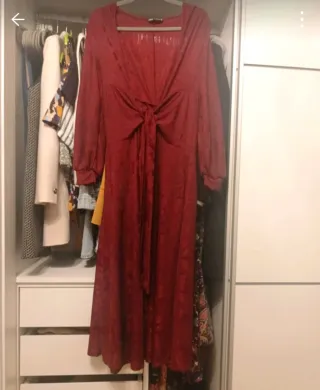 Vestido largo de Zara en color burdeos. Presenta un diseño con lazada en la parte delantera y manga larga. - Tejido con textura. - Escote pico. - Largo midi.