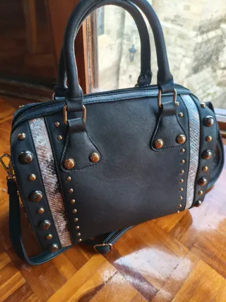 Elegante bolso negro con detalles que le dan un toque especial. - Diseño con tachuelas doradas y plateadas. - Panel lateral con estampado de serpiente. - Asas superiores y correa ajustable.