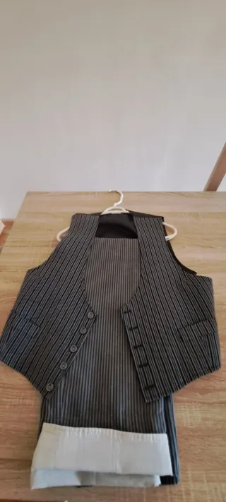 Conjunto de chaleco y pantalón de la marca Rocío. - Chaleco de rayas verticales. - Pantalón con detalle blanco en el bajo.