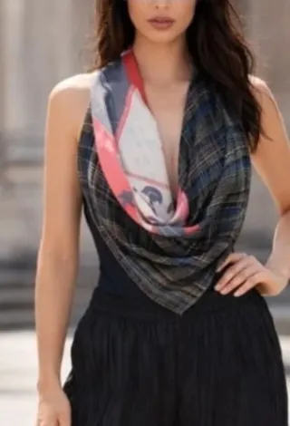 Pañuelo Mim de poliéster con un diseño vibrante y versátil. - Material: 100% poliéster. - Diseño: Estampado multicolor con detalles de cuadros y bloques de color.