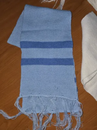 Conjunto de cuatro bufandas para niños. - Bufanda azul con rayas. - Bufanda blanca con rayas azules. - Dos bufandas blancas.