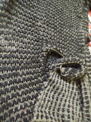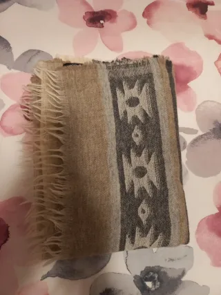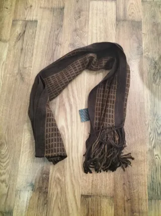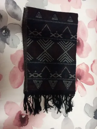 Bufanda unisex con un diseño geométrico y flecos. - reversible, por un lado negra y marron y por el.otro gris y marron - Diseño de triángulos y rombos, tipo etnico - Flecos en los extremos. - Tejido suave al tacto.