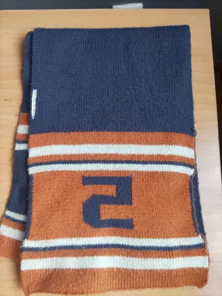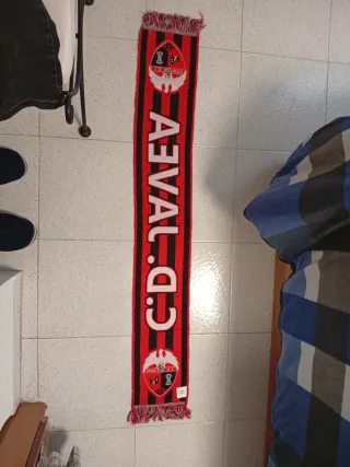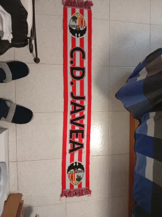 Bufanda del C.D. Javea con el escudo del equipo. - Diseño a rayas rojas y blancas. - Flecos en los extremos.