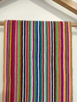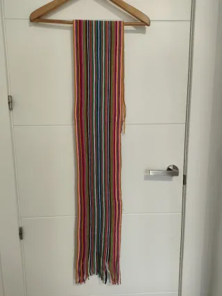 Bufanda con un diseño de rayas verticales vibrantes y alegres. Perfecta para añadir un toque de color a cualquier atuendo. Flecos en los extremos. Mira mi perfil, hay muchas cosas interesantes a buen precio Consúltame el tiempo de envío. Hay veces que por mi trabajo no lo puedo enviar en el plazo que marca la aplicación.
