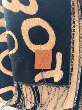 Conjunto de bufandas con diseños icónicos. - Bufanda Loewe con logo grande en negro y beige. - Bufanda Gucci con monograma GG en marrón y beige.