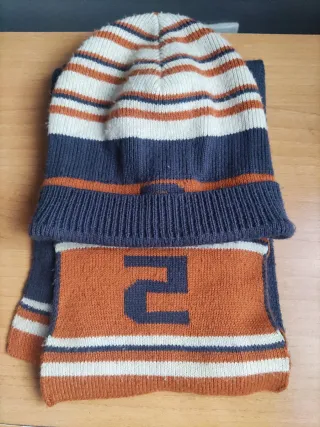Conjunto de gorro y bufanda a rayas. - Gorro de punto con diseño a rayas. - Bufanda a juego con diseño a rayas y número. - Tejido de punto suave.