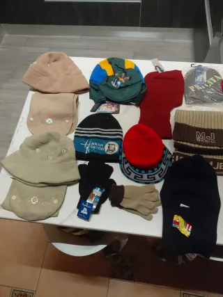Lote de gorros, bufandas y guantes de diferentes estilos y colores. Ideal para completar tu conjunto de invierno. - Gorro beige con detalles florales. - Gorro multicolor con estampado. - Gorro negro con texto. - Gorro rojo. - Gorro negro tipo pasamontañas. - Bufanda beige con detalles florales. - Bufanda de punto marrón y beige con logo MJ. - Bufanda roja. - Guantes negros. - Guantes de punto beige y marrón.