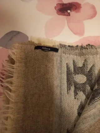 Bufanda o chal con un diseño étnico y flecos en los extremos. Suave y cálido, ideal para complementar tu atuendo. -de Sfera - Diseño de rayas y motivos geométricos. - Flecos decorativos en los bordes. - muy amplio (180 ×90 cm) - Textura agradable al tacto.