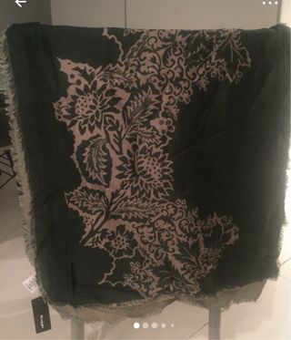 Precioso chal o bufanda con un diseño floral llamativo. Es suave y versátil. - Diseño floral en tonos beige sobre fondo verde. - Acabado con flecos en los bordes.De lana por uno de los lados