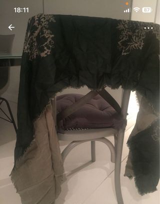 Conjunto de pañuelos y bufanda con un diseño de rayas finas. - Textura suave y ligera. - Acabado con flecos en los bordes. El conjunto se vende por 15 euros por separado a 6 euros cada una