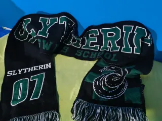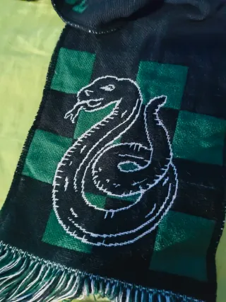 Bufanda de la casa Slytherin de Harry Potter. Presenta el escudo de la serpiente y el número 07. - Diseño tejido con detalles. - Flecos en los extremos. - Producto oficial. Más información por privado.