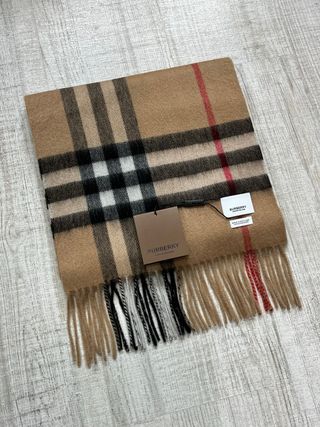 Bufanda clásica de Burberry con el icónico diseño tartán. - Material: Lana y cachemira. - Fabricada en Escocia. - Diseño a cuadros en beige, negro, blanco y rojo.