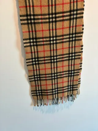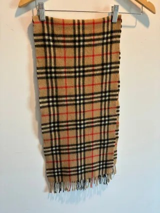 Bufanda con el icónico estampado tartán de Burberry. - Diseño a cuadros en tonos beige, negro y rojo. - Acabado con flecos en los extremos.