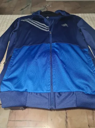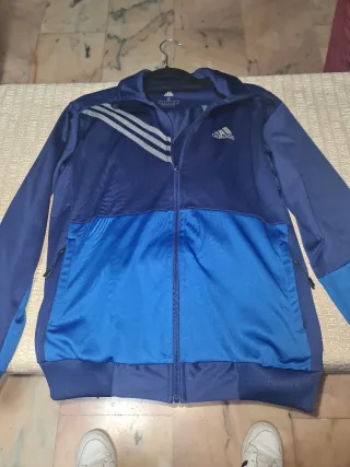 Chaqueta y pantalón deportivo Adidas con un diseño moderno y cómodo. - Color azul y gris. - Talla S. - Cierre de cremallera frontal. - Logo de Adidas en el pecho.