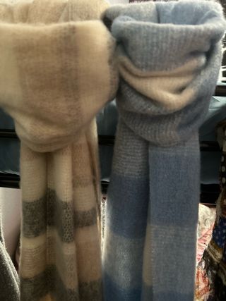 Conjunto de pañuelo de seda y bufanda de lana. - Pañuelo con estampado floral en tonos morados y azules. - Bufanda de lana con diseño a rayas en tonos marrones y beige. - Bufanda adicional con estampado geométrico en naranja y blanco. Ideal para dar toque de color en invierno Pañuelos a 1 chal grande a 3. Perchas refondas dos unidades 3€ Urge por mudanza.