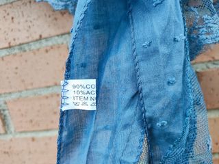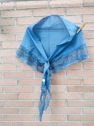 Pañuelo en pico pequeño azul con el borde con encaje y lleno de tipos. 150cm X 30 cm. 90% algodón y 10% acrilico