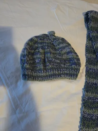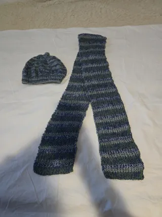 Conjunto de bufanda y gorro tejido a mano. Ideal para mantenerte abrigado. - Diseño a rayas en tonos azules y verdes. - Tejido suave y cómodo.