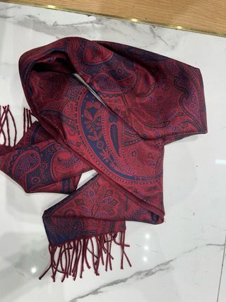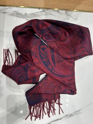 Elegante bufanda o chal estilo pashmina con un bonito estampado. - Diseño paisley. - Tonos burdeos y azul marino. - Acabado con flecos.