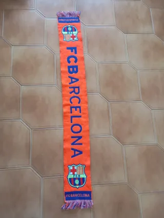 Bufanda del FC Barcelona con el escudo y el nombre del equipo. - Diseño con los colores azul y naranja. - Detalle de flecos en los extremos.
