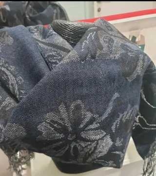 Bufanda con un bonito estampado en tonos azules y grises. Perfecta para complementar cualquier atuendo. - Diseño con motivos florales y geométricos. - Flecos en los extremos.