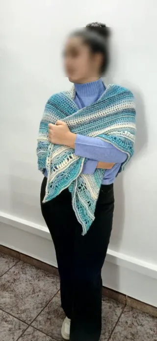 Precioso chal tejido a mano con un hermoso degradado de tonos azules y blancos. - Diseño único y artesanal. - Suave al tacto. - Perfecto para complementar cualquier atuendo.