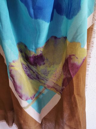 Pañuelo en tonos azul y salmón, muy ponible. Medidas 175x80 cm