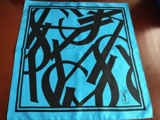 Pañuelo de seda con el icónico logo de Yves Saint Laurent. - Diseño geométrico en azul y negro. - Logo YSL en un extremo.