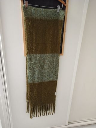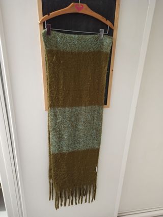 Bufanda de punto con rayas horizontales en tonos verdes y azules. Tiene flecos en uno de los extremos. - Tejido suave y cálido. - Diseño a rayas.