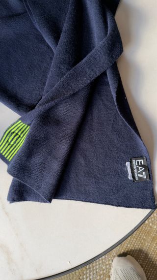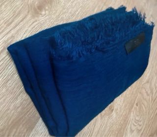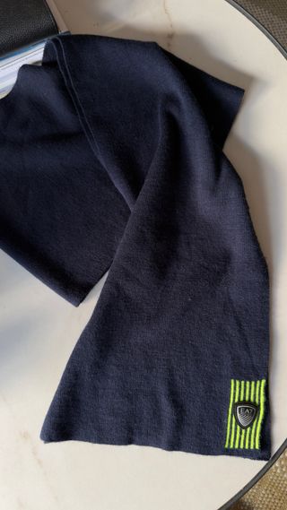 Bufanda original Emporio Armani, elegante y atemporal, en color azul marino con el logo EA tejido en tono más claro. Suave, agradable al tacto y muy cómoda, ideal para abrigar con estilo tanto en looks formales como informales. La bufanda está en buen estado general, bien conservada y con un uso normal. Tiene un pequeño desperfecto en una de las esquinas, poco visible y que no afecta a su uso ni a su estética general (se aprecia en las fotos). Una prenda de marca premium, perfecta para quien busca calidad, diseño y elegancia a un precio mucho más accesible.