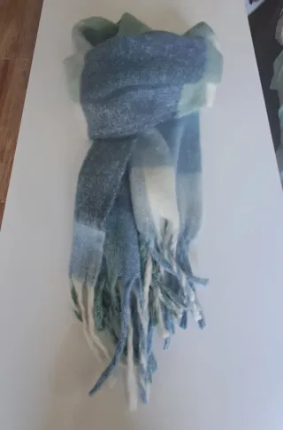 Bufanda suave con diseño de cuadros y flecos. - Diseño a cuadros en tonos azules y blancos. - Acabado con flecos en los extremos. - Etiqueta de la marca visible.