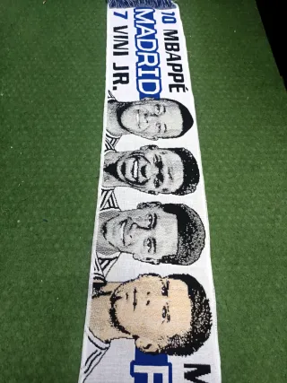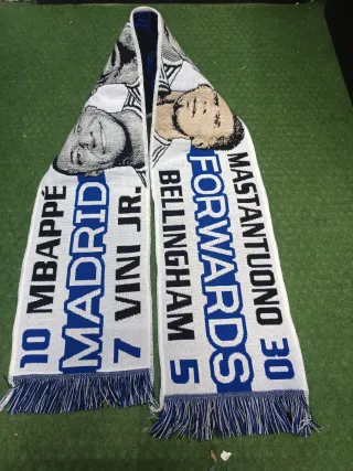 Bufanda del Real Madrid con imágenes de los delanteros. - Diseño con Mbappé (10) y Vini Jr. (7). Bellingham (5) y Mastantuono (30). - Colores blanco y azul.