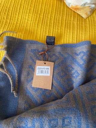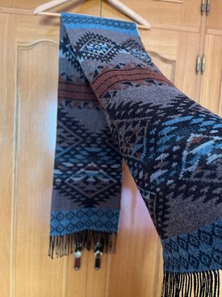 Bufanda con un diseño geométrico y étnico en tonos marrones y azules. Perfecta para añadir un toque de estilo a tus outfits. No tiene etiqueta porque se la quité. - Tejido suave y cálido. - Flecos en el borde inferior. - Diseño con motivos geométricos.