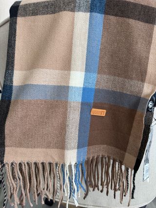 Bufanda con diseño de cuadros en tonos marrón y azul. Perfecta para complementar tu estilo. - Diseño a cuadros. - Tejido suave y agradable al tacto - Detalle de etiqueta de la marca. - Flecos en los extremos.