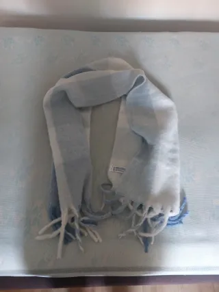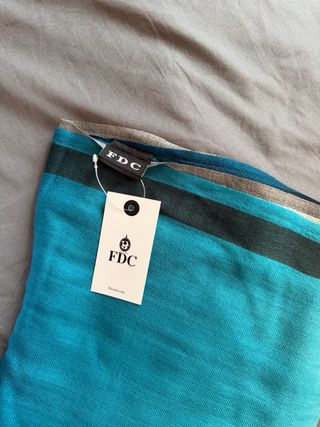 Bufanda de la marca FDC con un diseño degradado en tonos azules y turquesas. Incluye su caja original. - Diseño a rayas en los bordes. - Acabado suave al tacto. Lana merino y seda