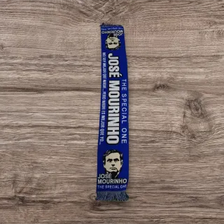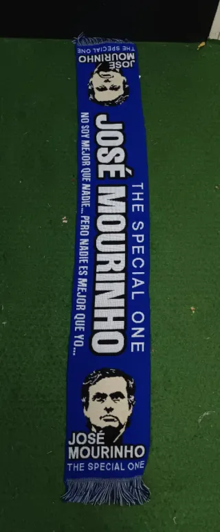 Bufanda de coleccionista dedicada a José Mourinho, The Special One. No soy mejor que nadie... pero nadie es mejor que yo... en español. - Colores: azul y blanco.