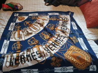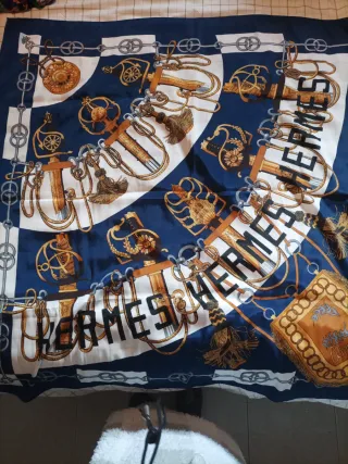 Elegante pañuelo de seda con un diseño clásico de la marca Hermes. - Motivos ecuestres y cadenas. - Tonos azules y dorados. - Acabado satinado.