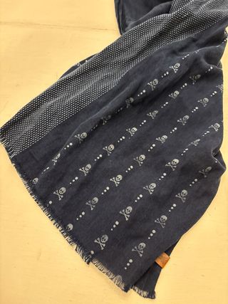 Bufanda de tela con un diseño llamativo. Es suave y ligera. - Estampado de calaveras y puntos. - Bordes deshilachados.