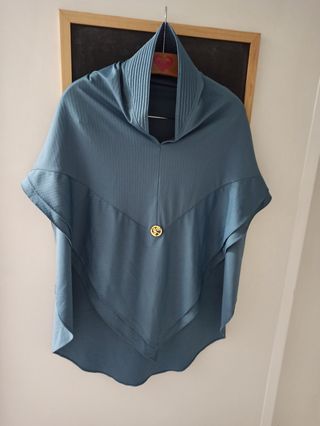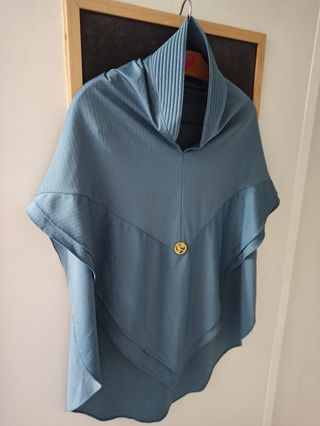 Hijab de estilo indonesio en un bonito tono azul. - Diseño con cuello alto acanalado. - Detalle de pin dorado en la parte frontal. - Capas superpuestas en la parte inferior.