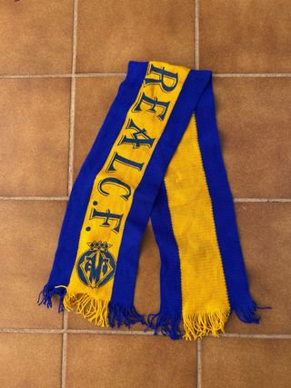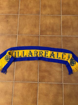 Bufanda del Villarreal Club de Fútbol con los colores representativos del equipo. - Diseño con franjas azules y amarillas. - Texto Villarreal y escudo del club. - Flecos en los extremos.