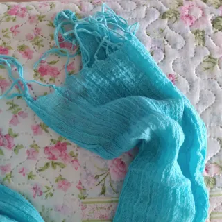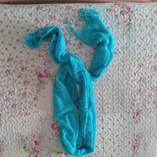 Pañuelo de tela en un vibrante color azul turquesa. Su textura arrugada le da un toque especial. - Material ligero y transpirable. - Diseño con flecos en los extremos.