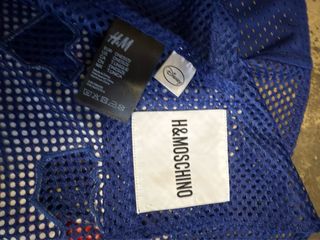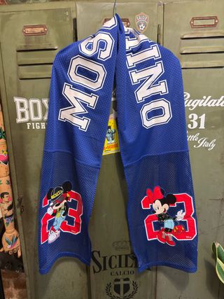 Bufanda de la colaboración Moschino x H&M con diseño de Mickey Mouse. - Tejido de malla azul. - Estampado de Mickey Mouse y Minnie Mouse con el número 23. - Letras MOSCHINO en blanco.