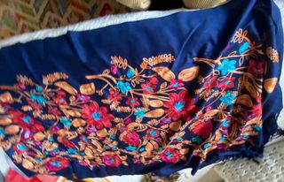 Elegante pañuelo o foulard con un diseño de bordado floral vibrante. La base es de un profundo color azul, realzada por flores en tonos rojos, rosas y turquesas, junto con detalles en hilo dorado. - Bordado floral multicolor. - Hilo dorado. - Flecos en uno de los extremos.