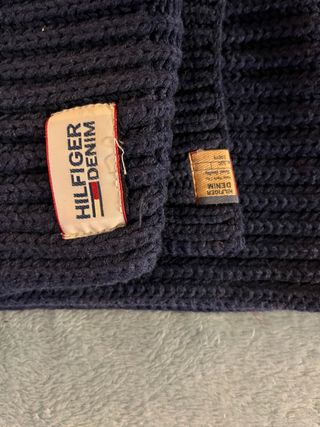 Preciosa bufanda de punto en azul marino de la marca Hilfiger Denim. Es suave y cálida, perfecta para el invierno. - Tejido de punto grueso. - Diseño clásico y atemporal. -New York City Finest Quality -Product Model 500 Tejido en punto, punto de canalé, punto ligero, logotipo de la marca, monocolor, bufanda