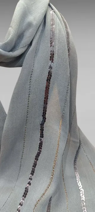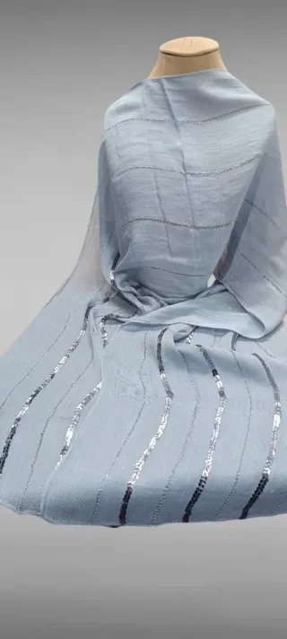 Elegante chal con un diseño sofisticado,.en tono azul.gridaceo. - Tejido ligero y vaporoso. - Detalle de brillos sutiles. - Aporta un toque de distinción a cualquier atuendo.