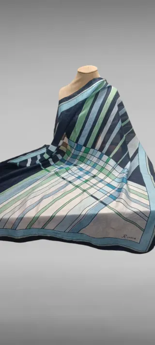 Pañuelo de cuello de seda Riviera. Azul marino combinado con rayas verdes y azules en fondo blanco, con un diseño atemporal. La seda proporciona extraordinaria ligereza y brillo a la calidad de la prenda. Orillado a mano. Cualquier defecto en la tela se produce por la seda. Medidas aproximadas 75x77. Tiene alguna minúscula perforación inapreciable una vez puesto.