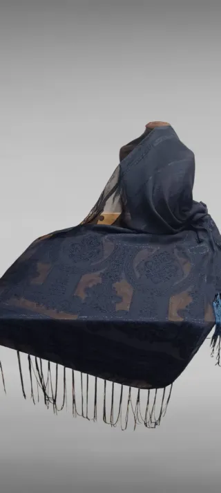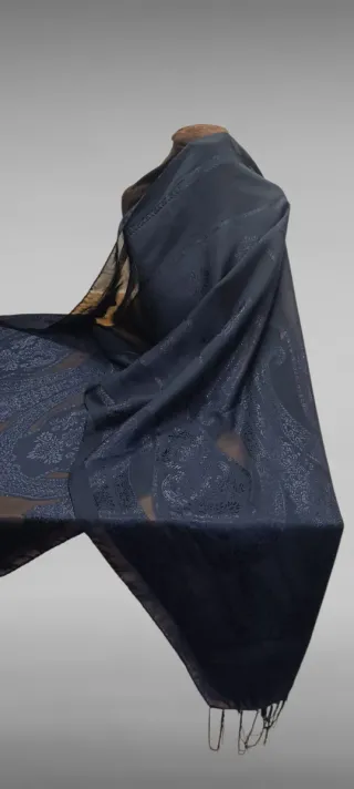 Elegante pashmina con un intrincado diseño. - Color base azul marino. - Detalles bordados en hilo dorado. - Patrón paisley y floral.