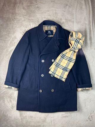 Elegante abrigo de paño azul marino, perfecto para cualquier ocasión. Incluye una bufanda a juego con el clásico estampado. - Abrigo de doble botonadura. - Cuello clásico. - Puños y forro interior con estampado Burberry. - Bufanda a juego con flecos.