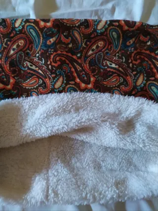 Mantente abrigado con este cuello o bufanda, ideal para los días fríos. Su diseño combina un estampado paisley vibrante con un forro interior suave. A Estrenar. - Estampado paisley en tonos marrones, naranjas y azules. - Forro interior de sherpa blanco muy cálido. - Diseño versátil que se puede usar como cuello o bufanda. De 100% Viscosa.